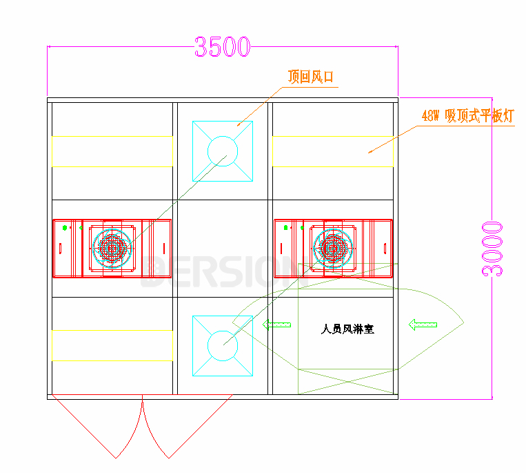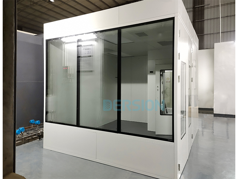 中大研究院此款實驗室外形尺寸3500W*3000D*2850H,潔凈度等級要求為千級,考慮到東莞天氣原因需要配備空調(diào)及除濕機,為保證除濕效果,潔凈室采用頂送頂回的結(jié)構(gòu),其他凈化設(shè)備包括風(fēng)淋室、逃生門等。