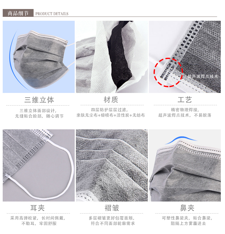 商品材質(zhì):無紡布+熔噴布+活性炭